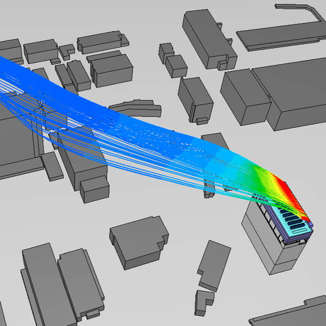 発電機煙突からの排熱およびガス濃度、粉じん拡散の検討が可能です。データセンター建屋への影響のほか、近隣や周辺建物への影響も検討することができます。
