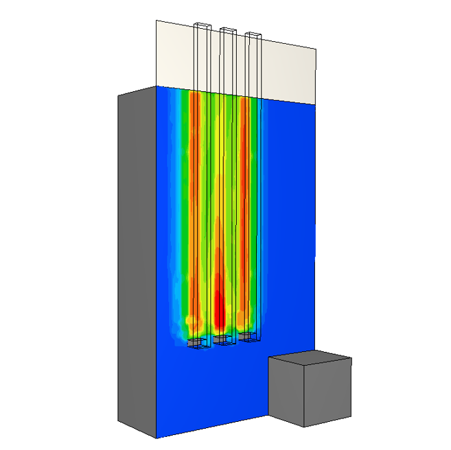 チラーや室外機停止時に稼働するバッファタンク使用時の温度変化を予測することができます。タンク内の温度分布のほか、出口の温度を時間を追って把握することができます。また、蓄熱時の検討も可能です。