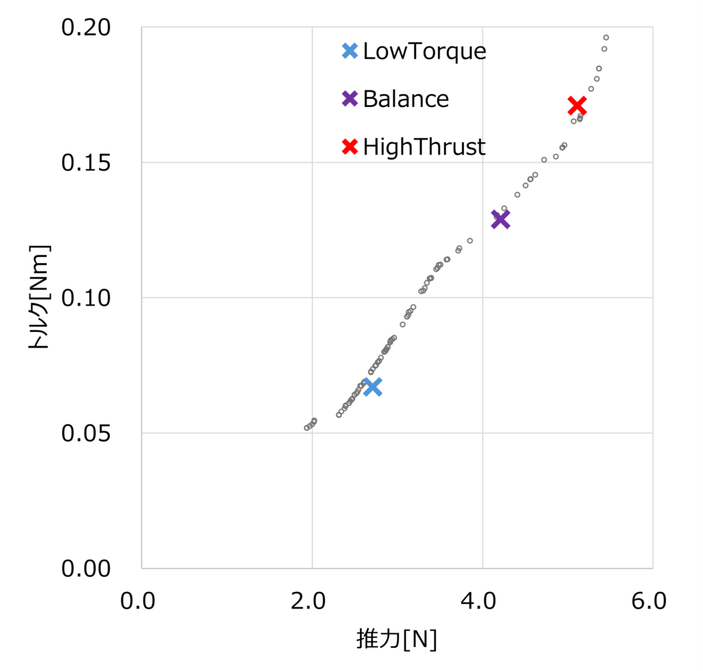 プロペラのそり率と傾き角を変化させた結果、パレート解と呼ばれる複数の最適解が得られました。